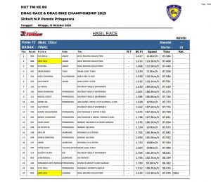 RacingIndonesia.com- 14 Oktober 2025. Ajang HUT TNI Drag Bike Championship 2025 yang digelar pada 12 Oktober 2025 di Sirkuit N.P. Pemda Pringsewu, Lampung, menjadi saksi kiprah gemilang pembalap wanita asal Jawa Barat, Tia Bocil. Turun di kelas Matic TU 155 cc Open, Tia tampil begitu impresif bersama tim Diva Racing Collection, dan sukses mencatatkan waktu fantastis 07.384 detik.