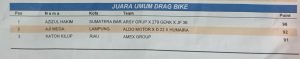 Puncak pencapaian diraih oleh Azizul Hakim, yang sukses mengamankan gelar Juara Umum kategori Open dengan total 96 poin. Torehan ini menjadi bukti kualitas pembalap sekaligus kesiapan teknis tim dalam menghadapi ketatnya persaingan drag bike di Sumatera.