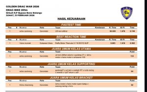 “Alhamdulillah, pada balap kali ini kami bisa membawa pulang tiga gelar juara umum kelas utama, supporting, dan bracket serta fastest time. Ini adalah hasil kerja keras seluruh anggota tim yang berjuang maksimal di Golden Drag War 2026,” ujar Ilham.